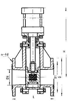 该阀利用内置双向弹簧,将两个阀板反向压在阀门两端阀口密封面轨道上,手动或气缸垂直拉动两个阀板同步运动,达到开启和关闭的要求。