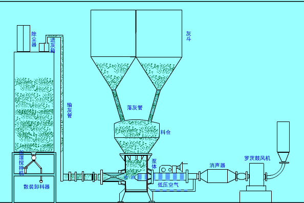 选用低压气力输送设备气力输送设备为核心设备组成气力输送系统,首先用户应提供:系统要求输送量,输送距离,或物料的理化参数、高温度和正常工作温度;若是锅炉除尘器下,则应提供除尘器灰斗布置及灰量分配等基本参数。然后由我厂技术人员先确定输送基本方案,如所需气量、如何分组、连续泵型号、进气和输送管道配置、库顶除尘器配置,终由用户审查确定。